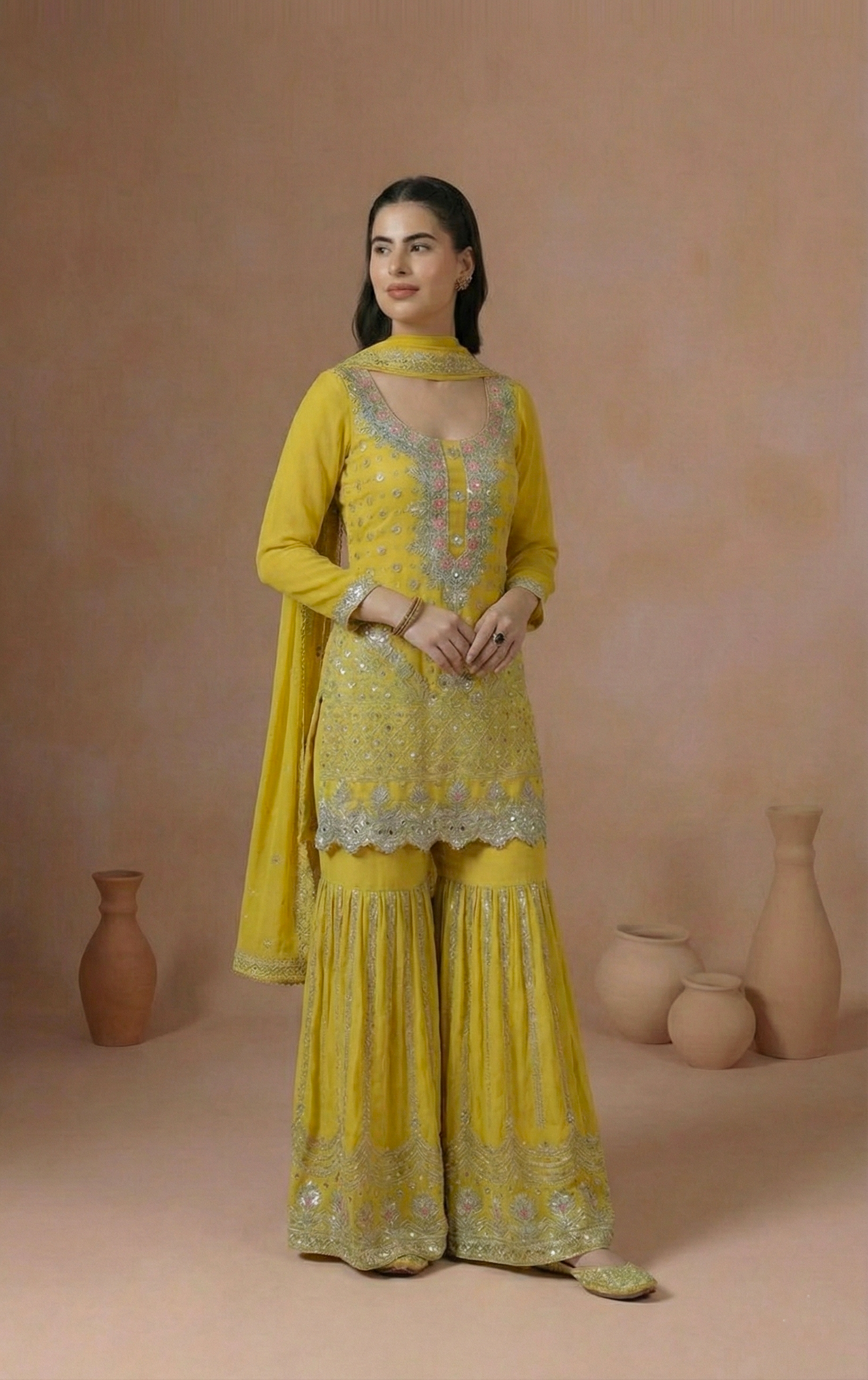 Add a radiant charm to your ethnic wardrobe with this stunning yellow embroidered kurta sharara set, designed to bring together elegance, tradition, and modern comfort. Crafted for festive occasions and special celebrations, this outfit is a perfect blend of rich craftsmanship and contemporary silhouette.